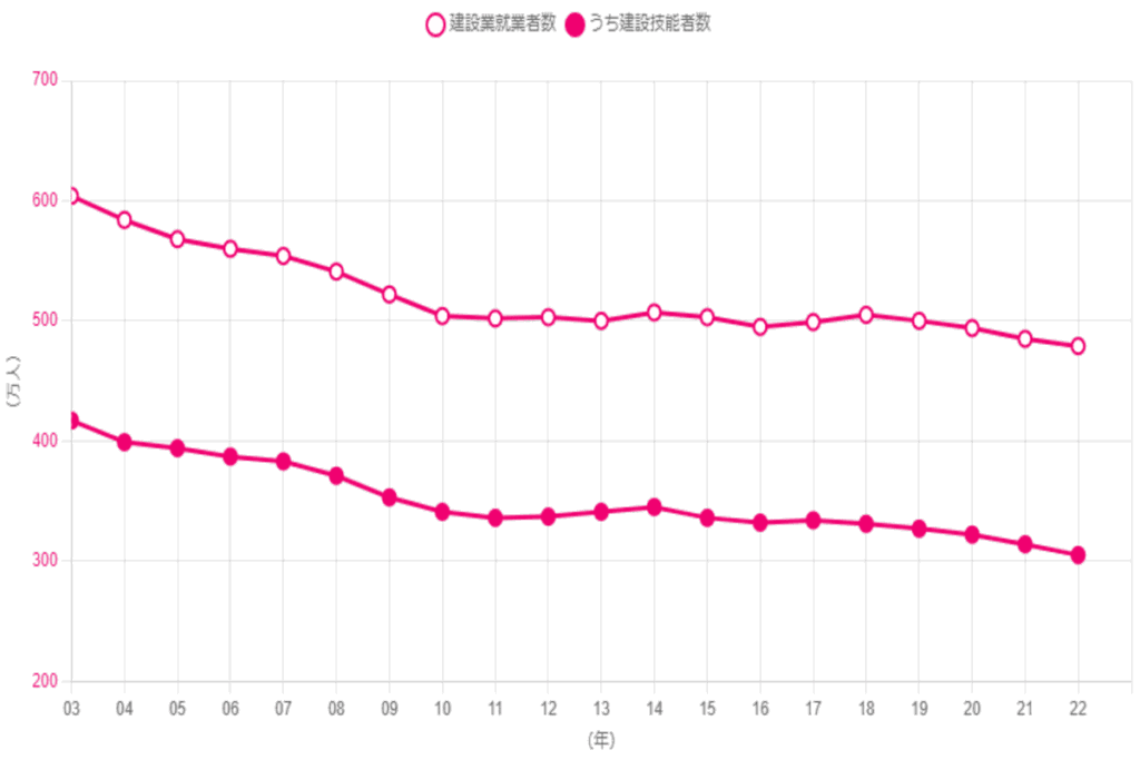 特に建設業は人で不足です。2003年600万人ぐらいだったのに20年後には480万人ぐらいかな。そして、これからは増える予定は無いでしょうね。もともと少ない技術者も同じように減っています。