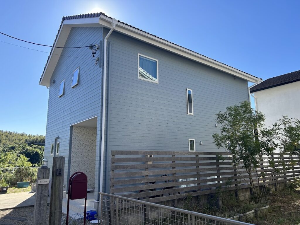 ブルーグレーのさわやかな外壁にしました。エアコンカバーや換気扇フードも外壁と同じ色で塗装されてきれいになりました。10年ぐらいで塗装するのがいいと言われるのが分かるぐらいの仕上がりの良さです。