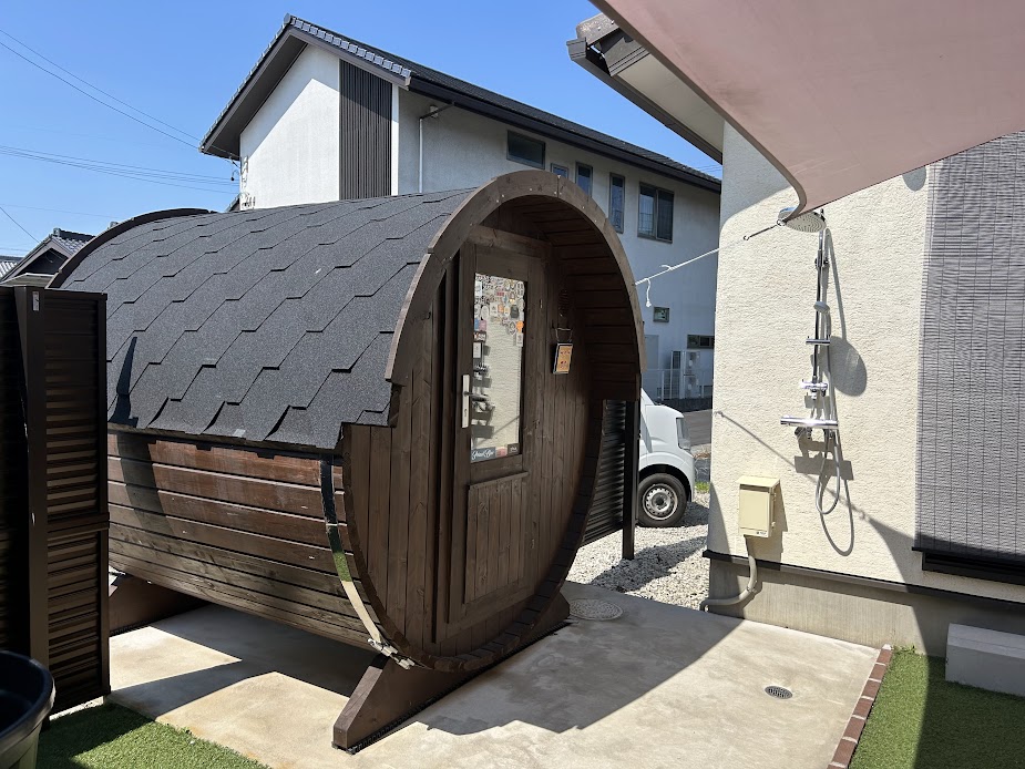 バレルサウナは、4人は入れます。結構広い!直ぐに暑くなるそうです。
