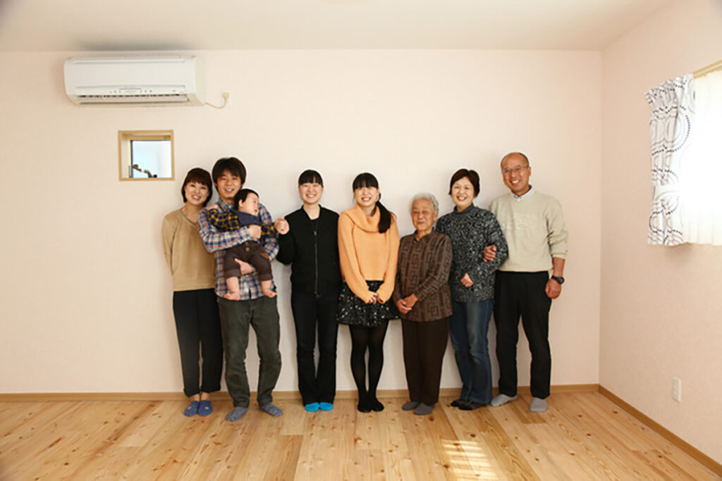 リフォームか建て替えかを迷っていた頃、タイミングよく目にした完成見学会のチラシがきっかけでIN THE HOMEを知った施主。資金調達への不安は、FP相談で「なんとかなるかも」と思えるようになったといいます。決め手は、何度顔を合わせても一度も勧誘せず丁寧に話を聞いてくれるスタッフの対応、そして「35坪の敷地に大人5人と2台駐車場は可能ですか?」と尋ねたとき、前田さんだけがニッコリ笑って「出来ますよ」と即答してくれたことでした。探していた床板にも出会え、希望を一つひとつ形にしていく打ち合わせは大変ながらもワクワクの連続。「決めたことを何度も変更したり、平岩さんに休日もメールしてしまいましたが、いつも『大丈夫です』と対応してもらえました」と笑う施主。完成したわが家を前に、その数々のやりとりが“安心の家づくり”へとつながったと振り返ります。