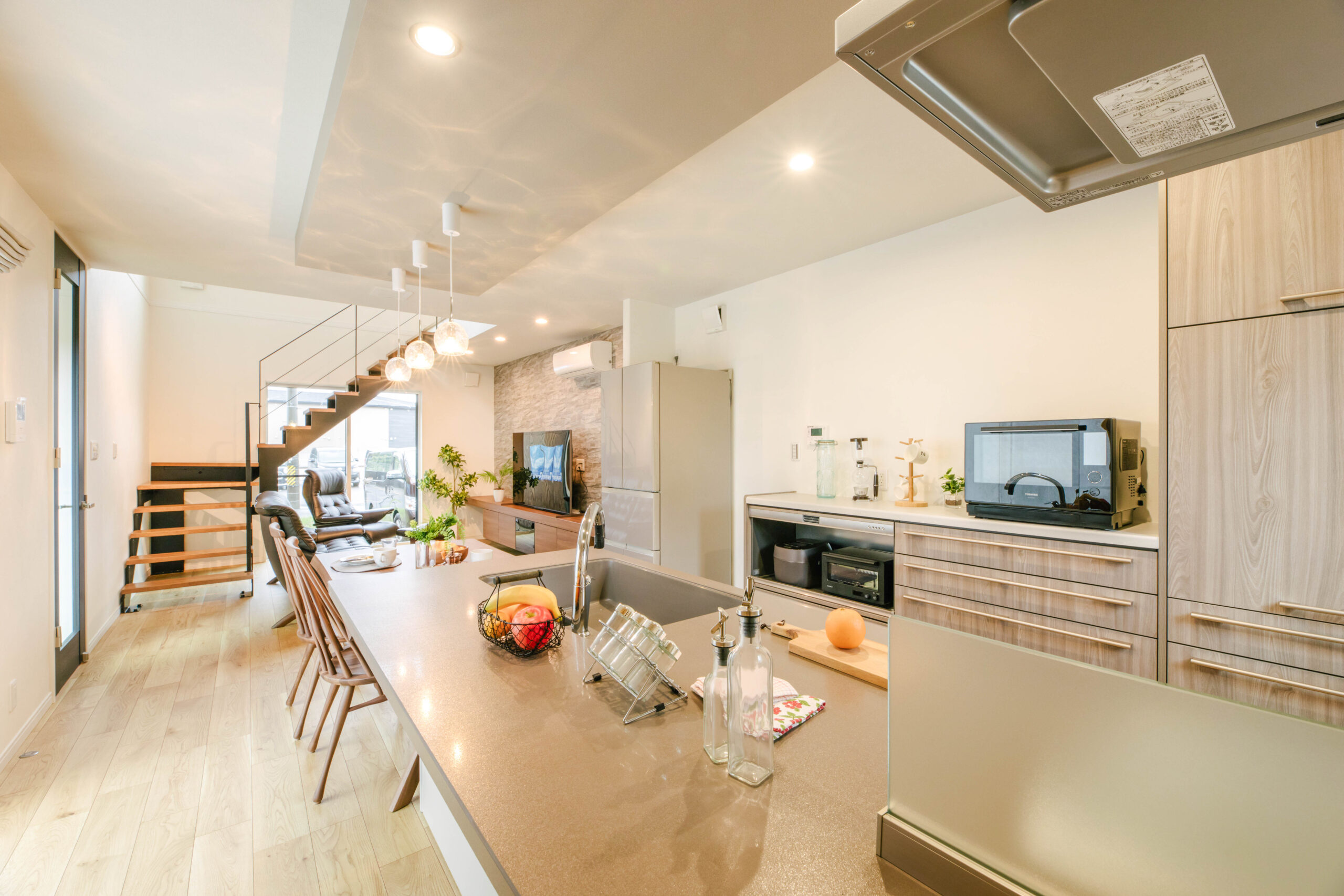 キッチンとダイニングをつなげて家事をしやすく 折下げ天井がポイントです
