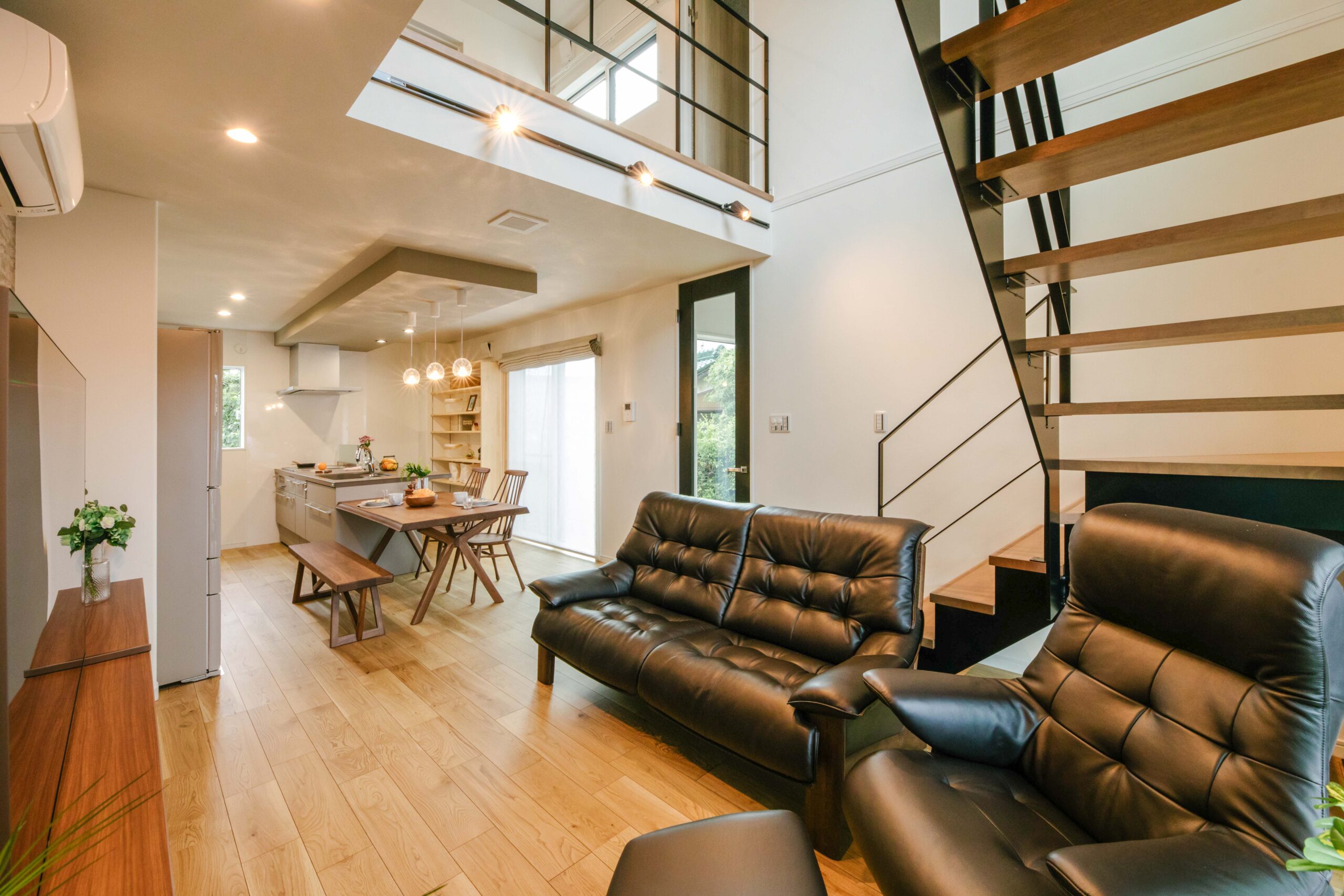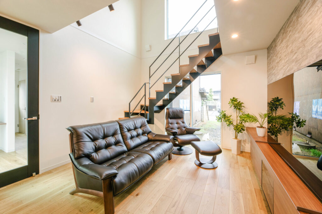 50代夫婦の住まいは、2つの厳しい条件がある敷地に建っている。一つ目の条件は、北側に道路がある三角形の敷地で高さ制限がある事。既存宅の関係もあり大きく配置を変えられない条件のなか、L型にする事で高さ制限をクリアして2階建てを設計できた。もう一つの厳しい条件は、南側に隣家があり陽当たりが厳しい事。これには太陽光があたる位置にリビングと吹抜けを設け、窓やガラスドアなどで明るさと解放感を設計して明るさと陽当たりの省エネを実現した。省スペースの吹抜けの為、階段を鉄骨にする事で構造的に可能にしたのは、設計知識と施工精度があるからできる事だ。必要なところにだけ窓を設け明るい室内する事、将来のメンテナンスコストを削減するなどのコストダウンも考えた設計をしている。