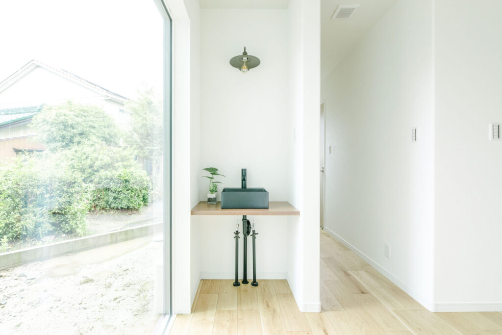 玄関手洗いはオーダーメイド 毎日使うところだから好きなボール、水栓、照明を選びました