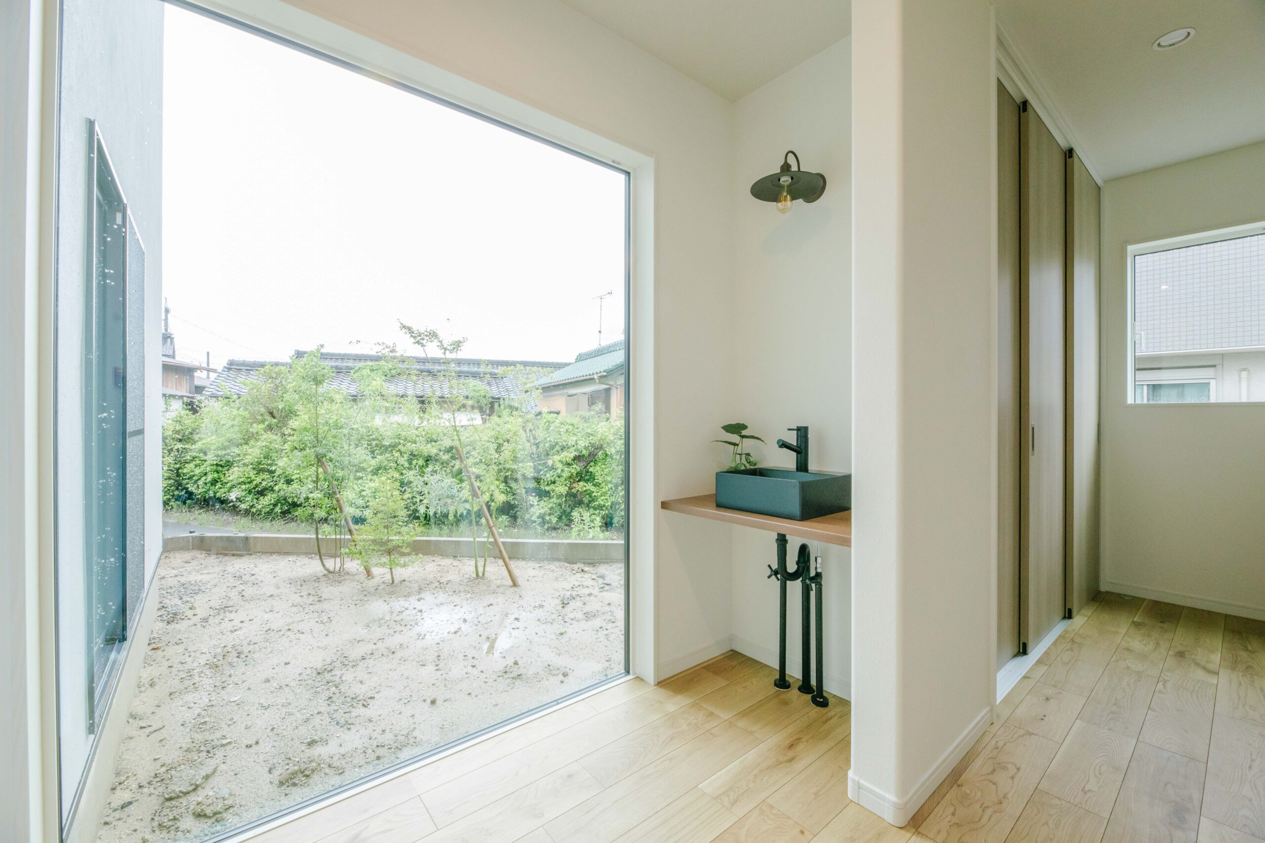 玄関を入ると正面に大きな窓があり、中庭を眺められる この解放感と明るさは最高です