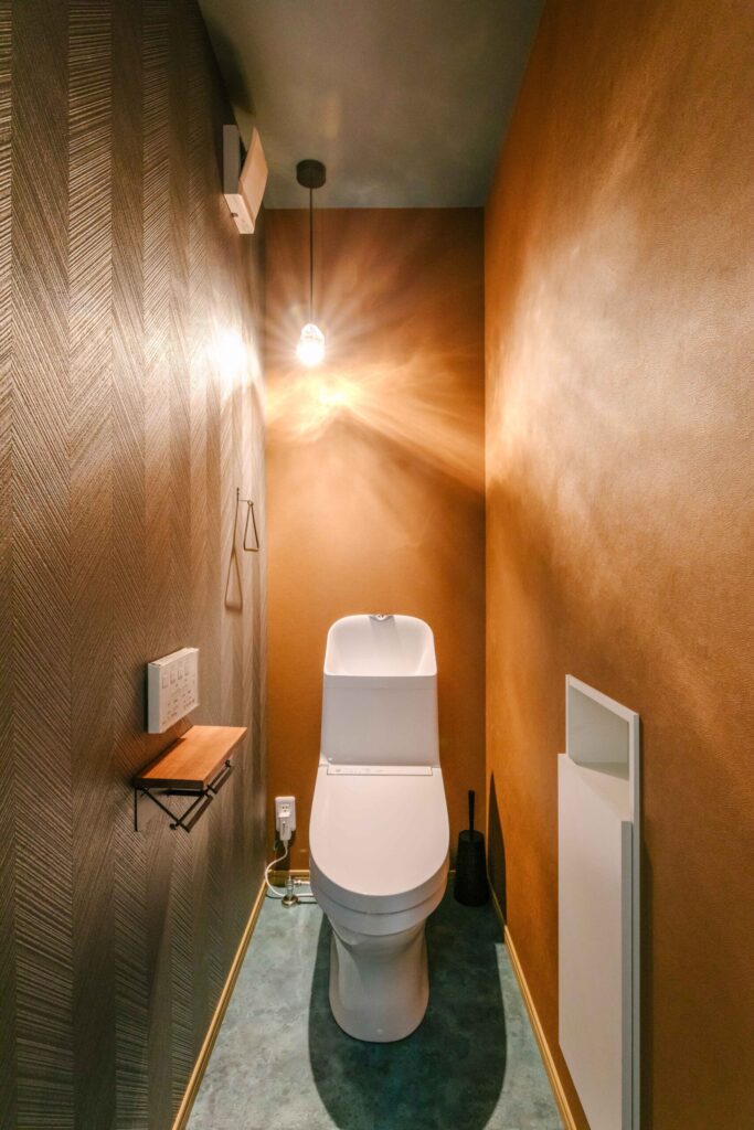 「店舗みたいなトイレにして」とのご要望でグリーンの床と天井 オレンジの壁 角にペンダントライト