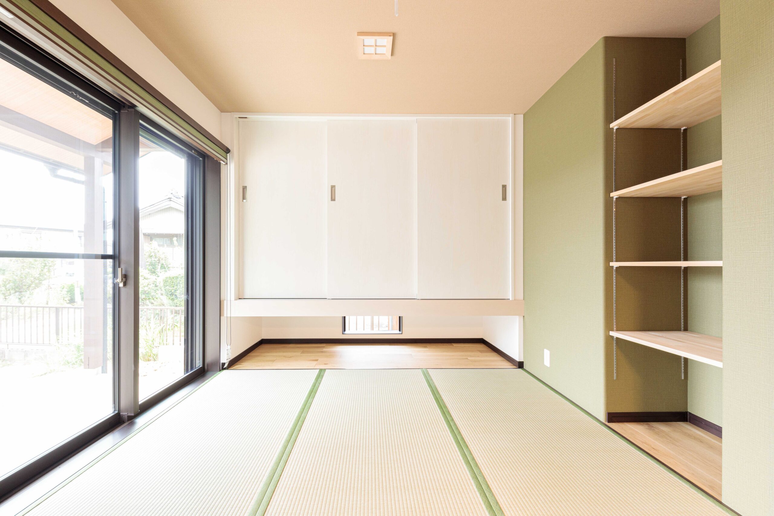 リビングの奥には小上がりの畳コーナー お子様のお昼寝、大人のごろ寝のスペースとして大活躍! ロールカーテンで仕切れるようにしています