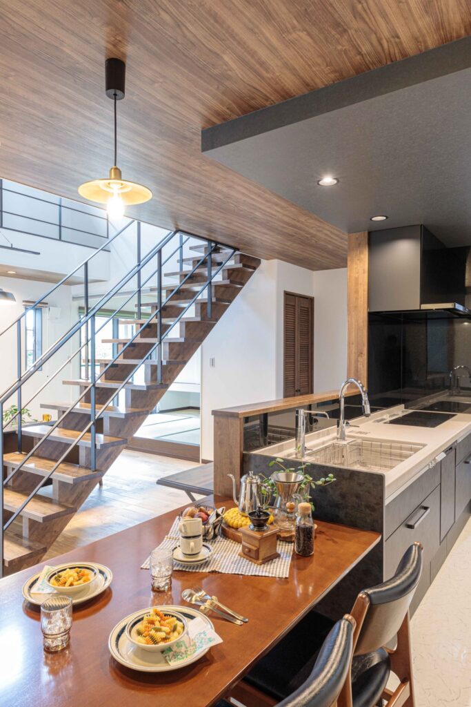 天井を折り下げてキッチンの色に合わせてキッチン周りはダーク系でまとめました。