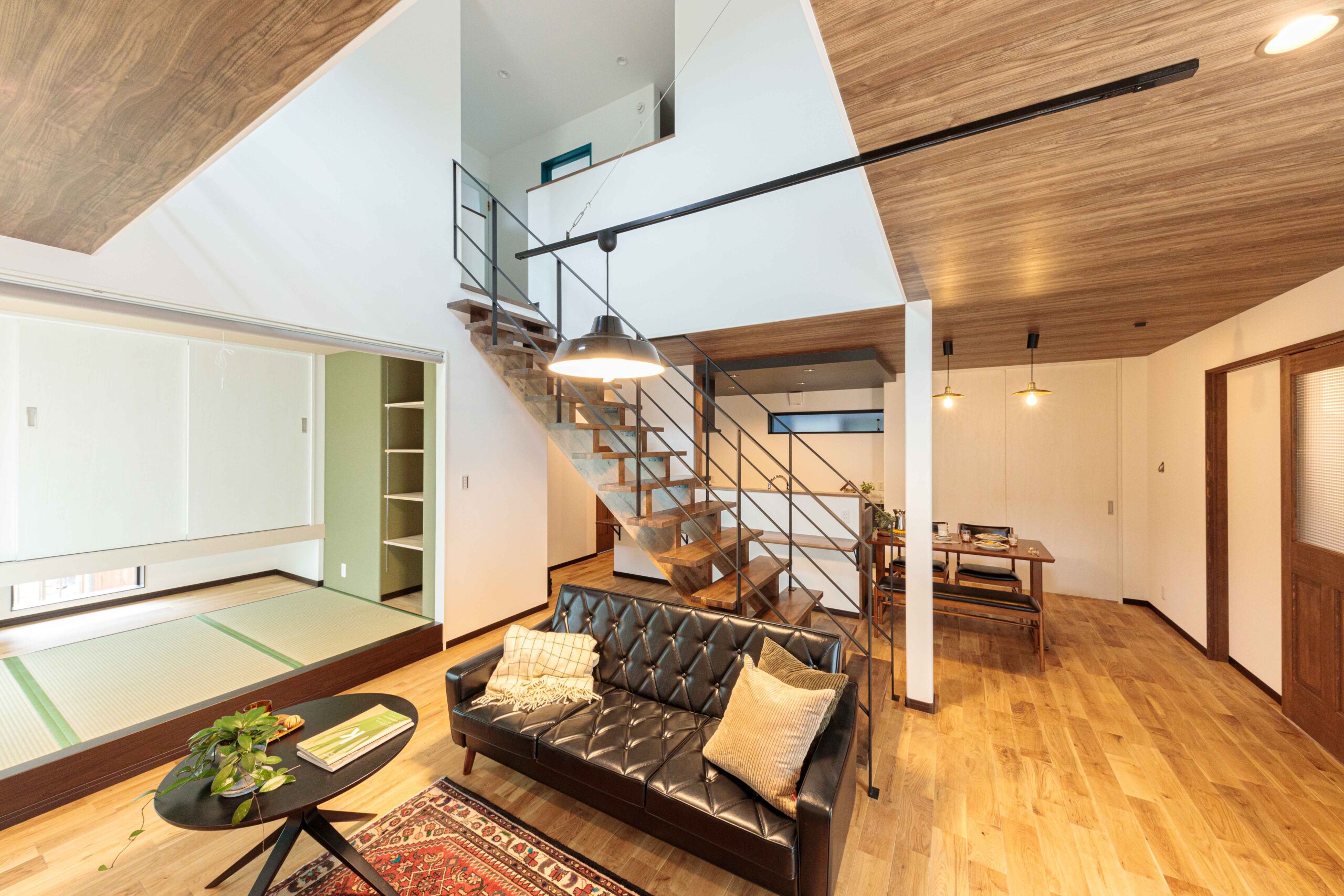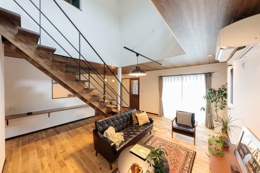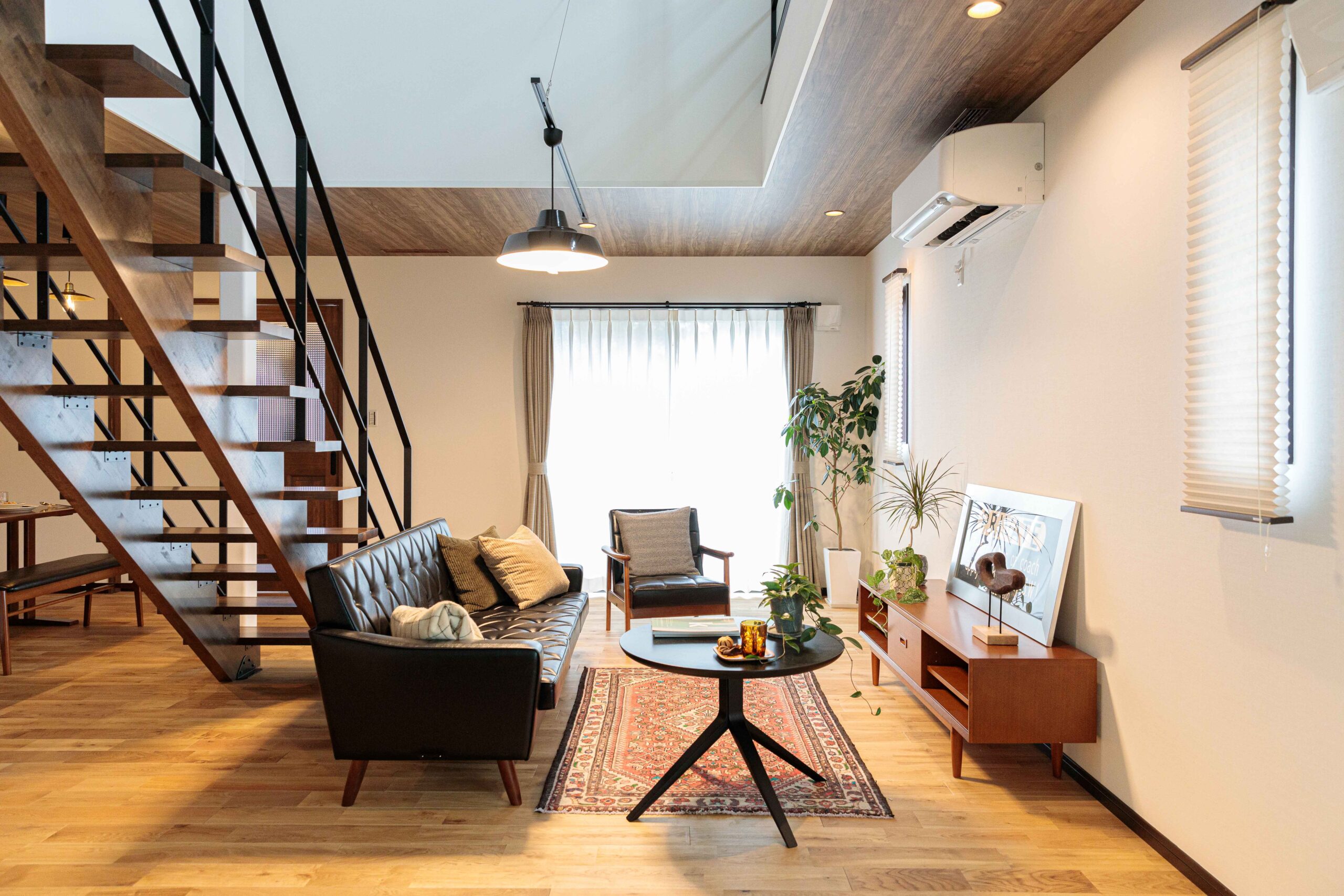 木目とアイアンのブラックでまとめたインテリア。吹き抜けから光が入り明るいリビングになっています
