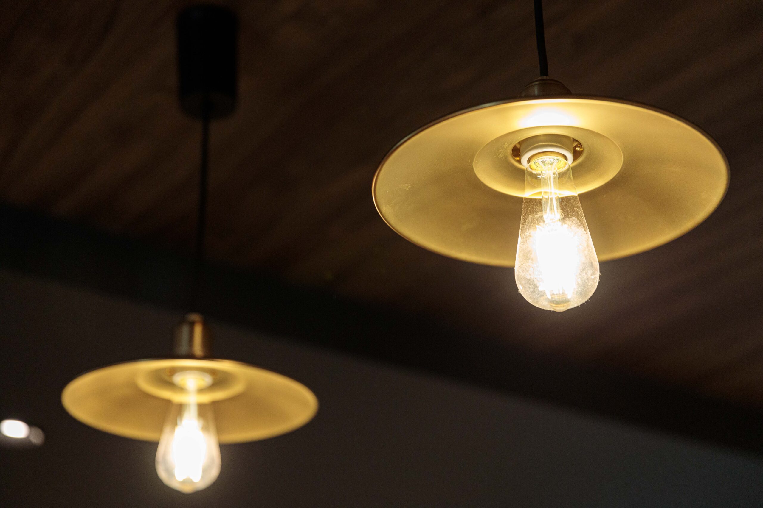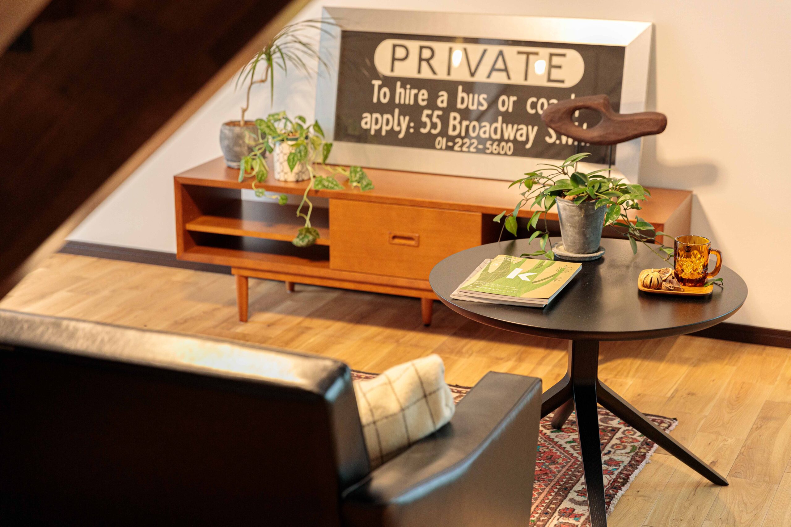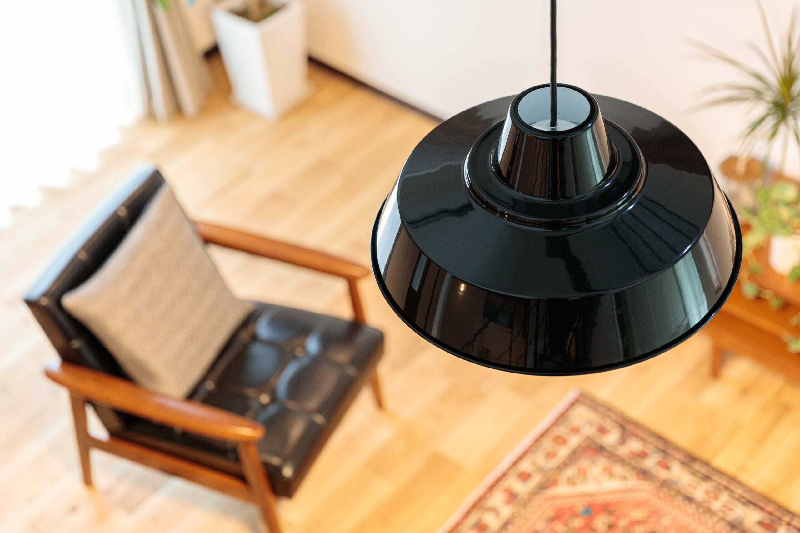 木目とアイアンのブラックでまとめたインテリア。吹き抜けから光が入り明るいリビングになっています