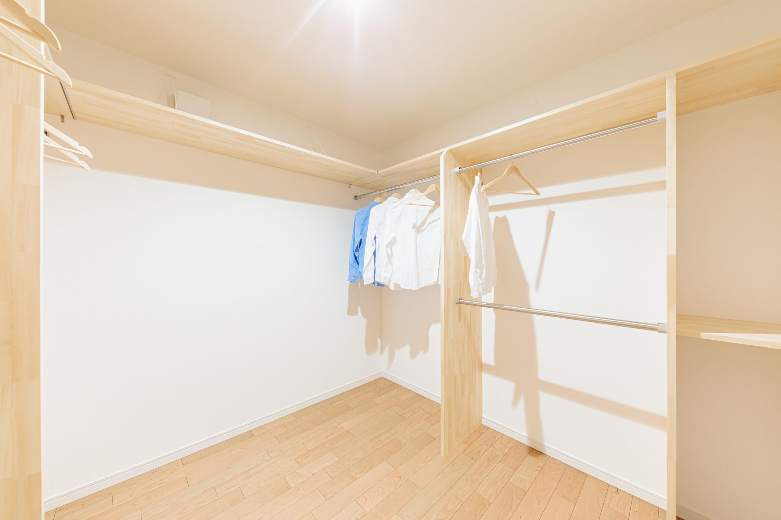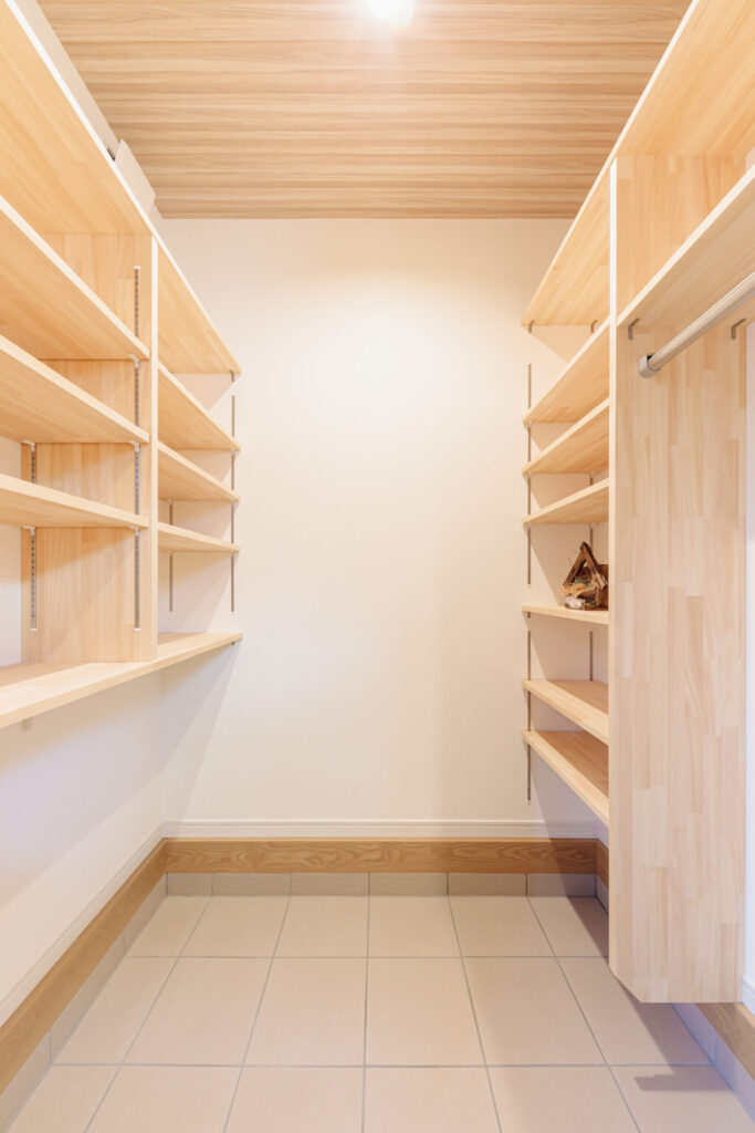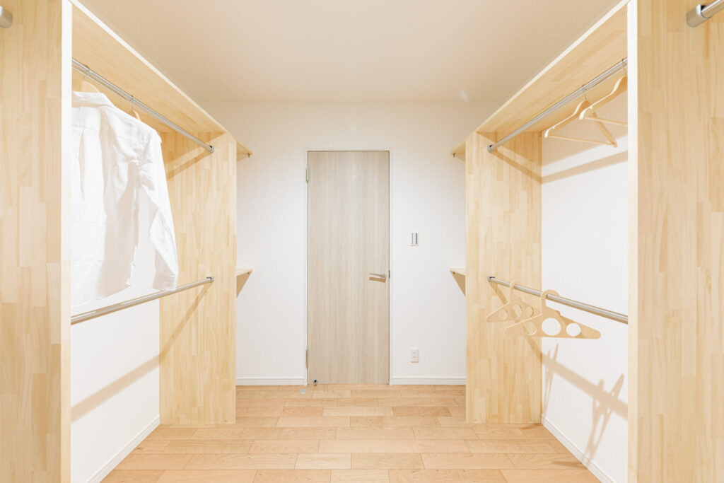 2階ウォークインクローゼットは、物干し場の近くにあります。「干す、たたむ、収納する」がスムーズに出来ます。