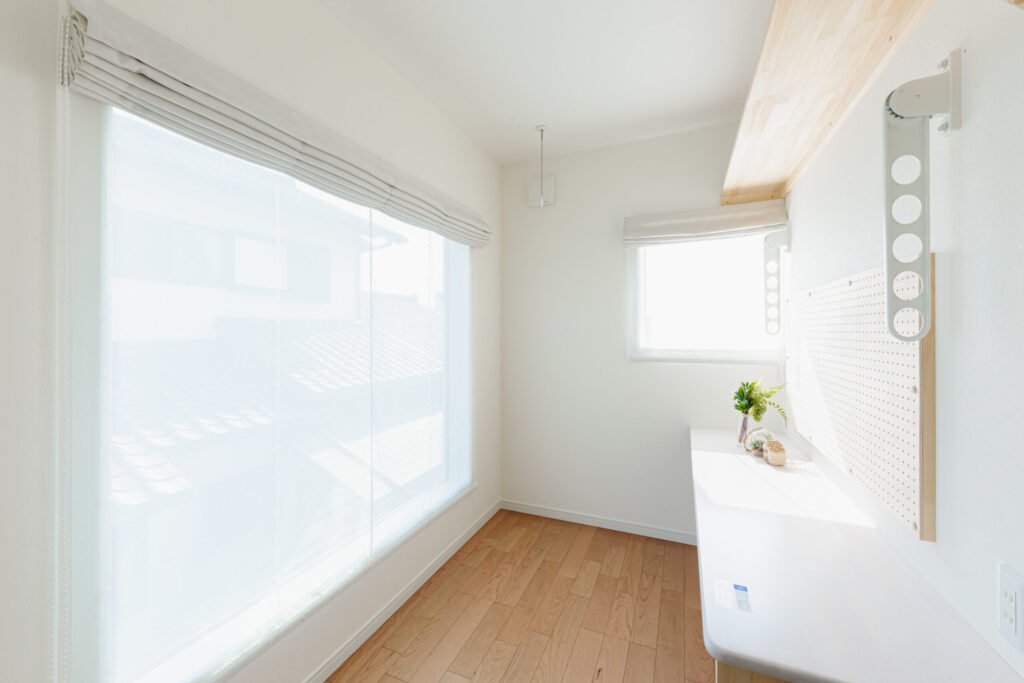 2階の物干し場 雨の日でも梅雨時期でも乾きます。冬は夜でも洗濯物が干せるので、忙しい朝の時間が節約できます