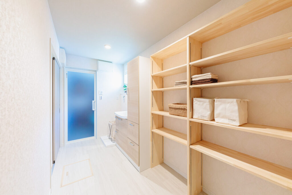 洗面脱衣室には、入口が2箇所ある。玄関からの入口とキッチンからの入口。奥様の家事効率を考えての仕様です。人によって、間取りによって、価値観によって、設計も合わせていきます