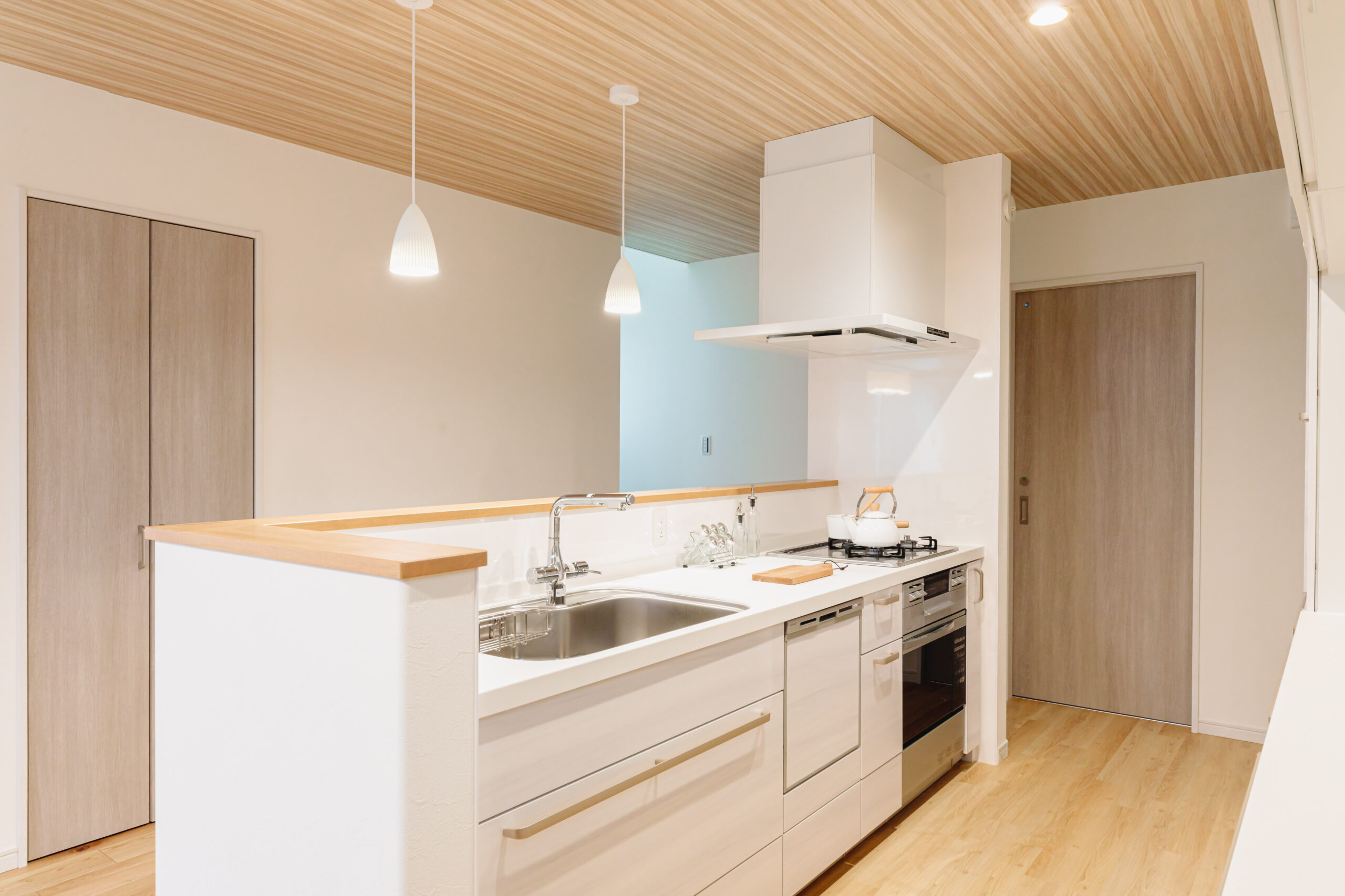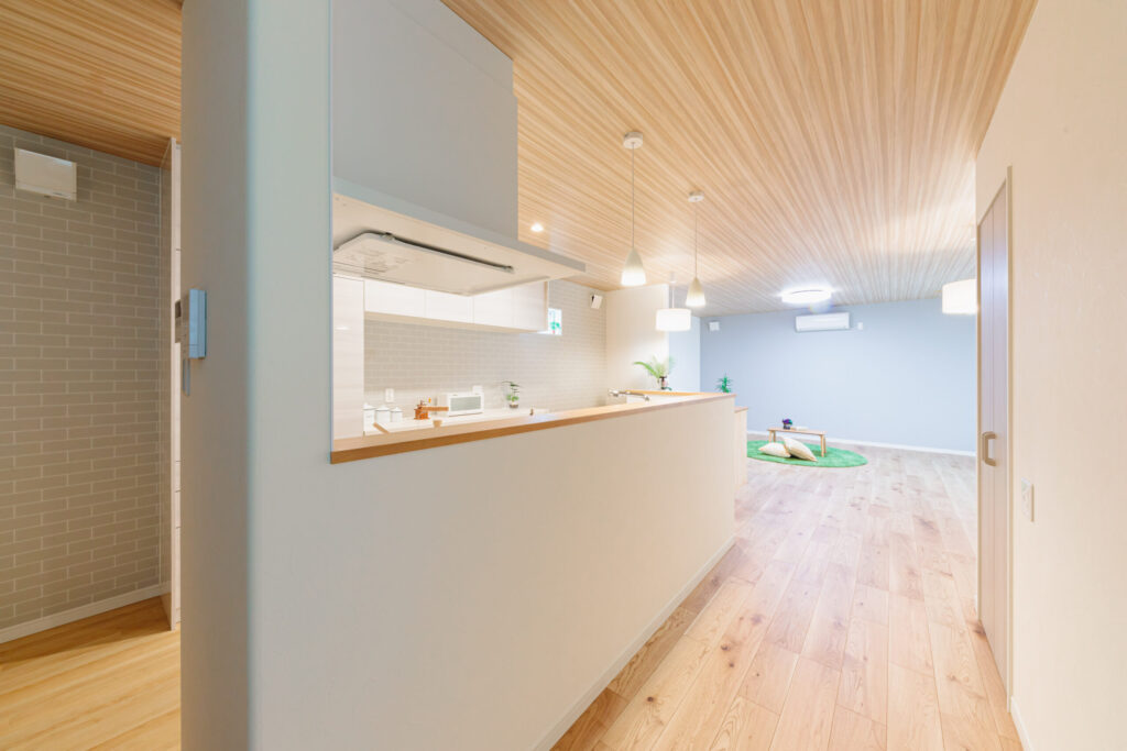 キッチンの前を通り、奥がリビングです。ブルーグレーの壁紙でデザインを合わせています。細長い敷地の特徴を活かした間取りにしました。