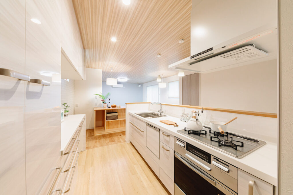 奥様の趣味はパンづくり。パンの生地をつくるカウンターやオーブンなど奥様に合わせて設計しました。パンが焼きたいからガス仕様にしました。