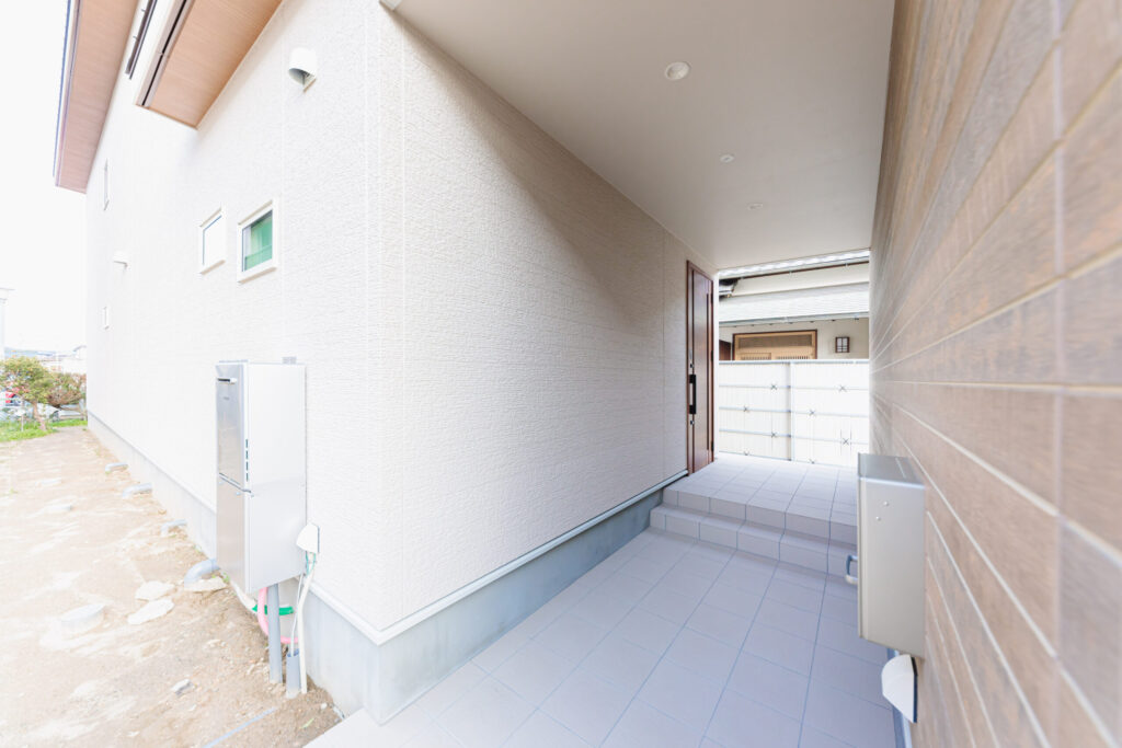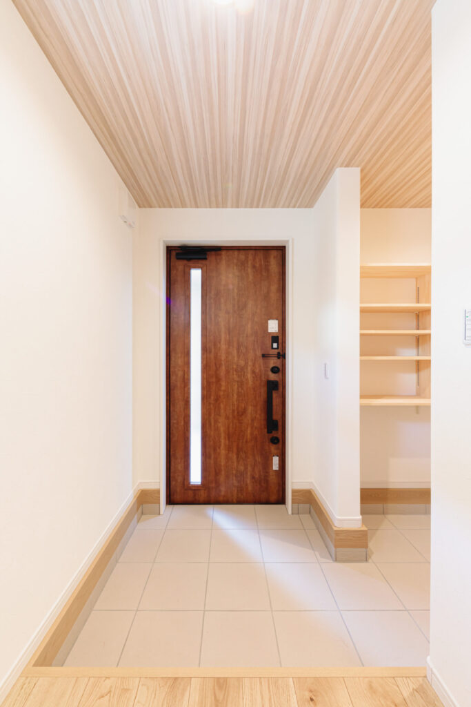 雨に濡れない玄関は使い勝手が良い。外からも見られなく、風も室内に入らないのもお気に入りポイント!木目の壁がデザインのポイントになっている。