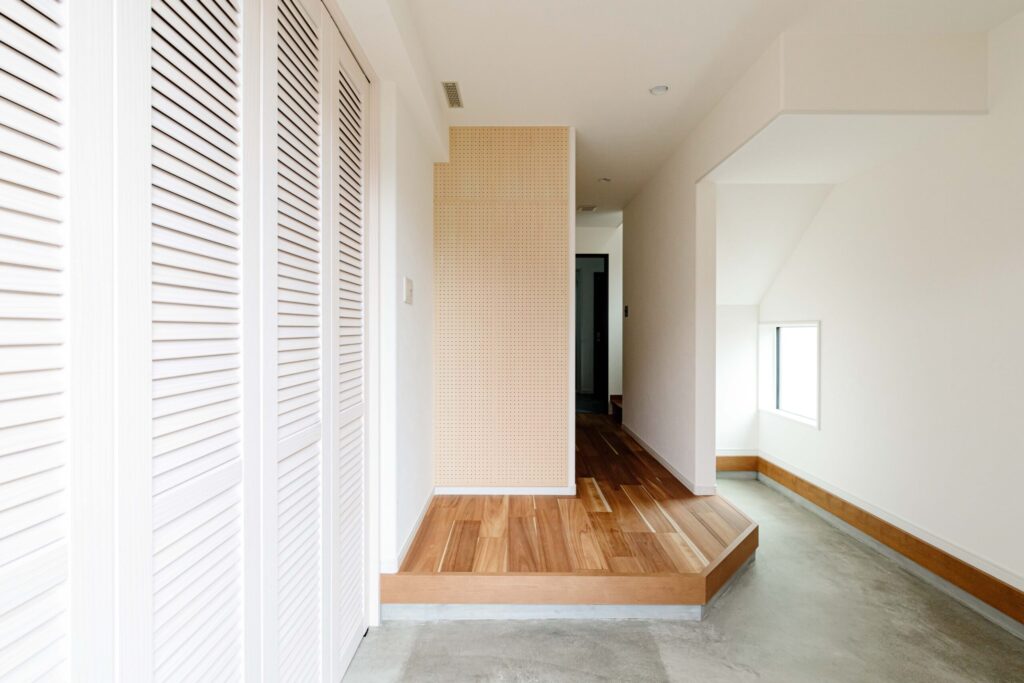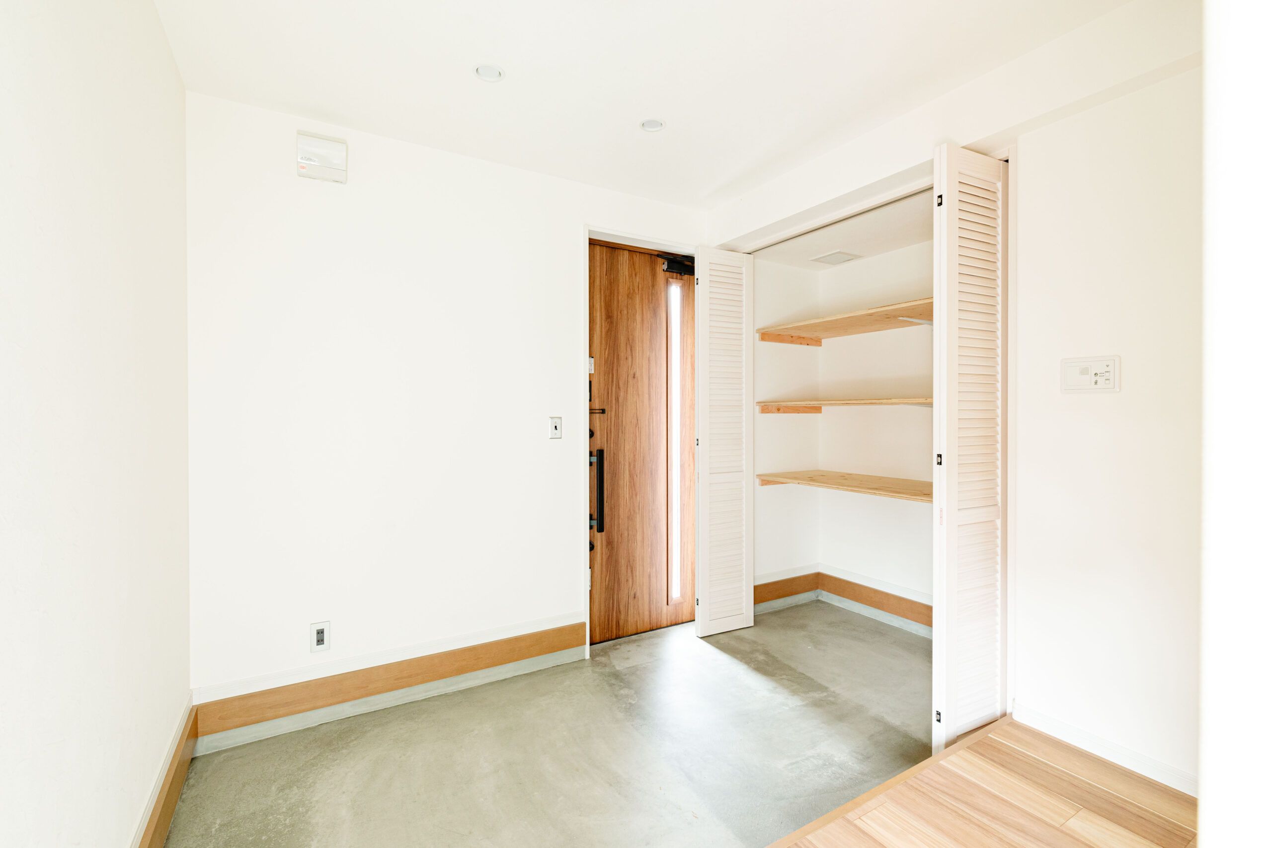 玄関床はコンクリート、壁もシンプルに白色、木材や鉄などの素材感を出したデザインにしています