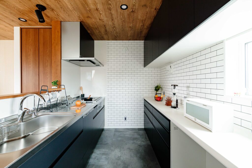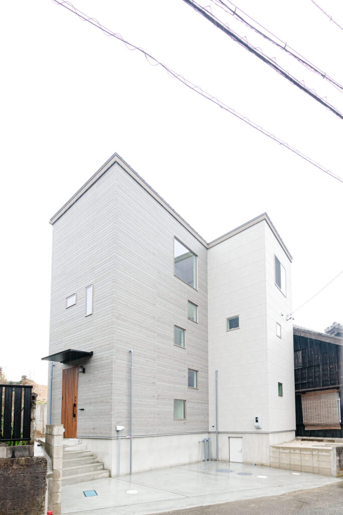 道路からみると少し斜めに建っている3階建ての住まいは、真南に配置されており太陽光を効率的に利用している。冬は日射しを取り込み暖かく、夏は日射を遮り室温を上げない工夫により省エネを実現。デザインはコンクリートの床やアイアン、電気パイプを現しに仕上げインダストリアルな雰囲気に。ただ暮らしやすさのバランスも大切にしたかったため一部のみにとどめた。施主さんの一番の要望である広さ8畳もの3階のバルコニーからは海を眺めることができ、友人たちとバーベキューを楽しむために電気や水回りも完備。また、バルコニーの床下が結露しないように換気設計もされている。建物の耐久性が落ちない設計が出来るのは現場を知っている建築士だからできることだ。厳しい条件の土地に、施主の想いと建築士の技術がいっぱい詰まった家になった。