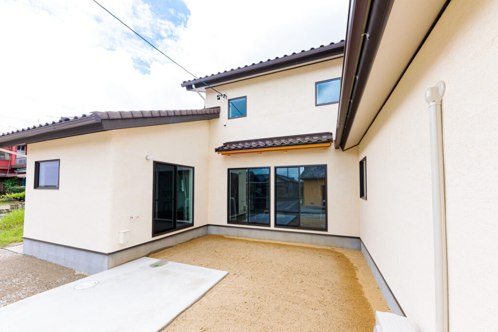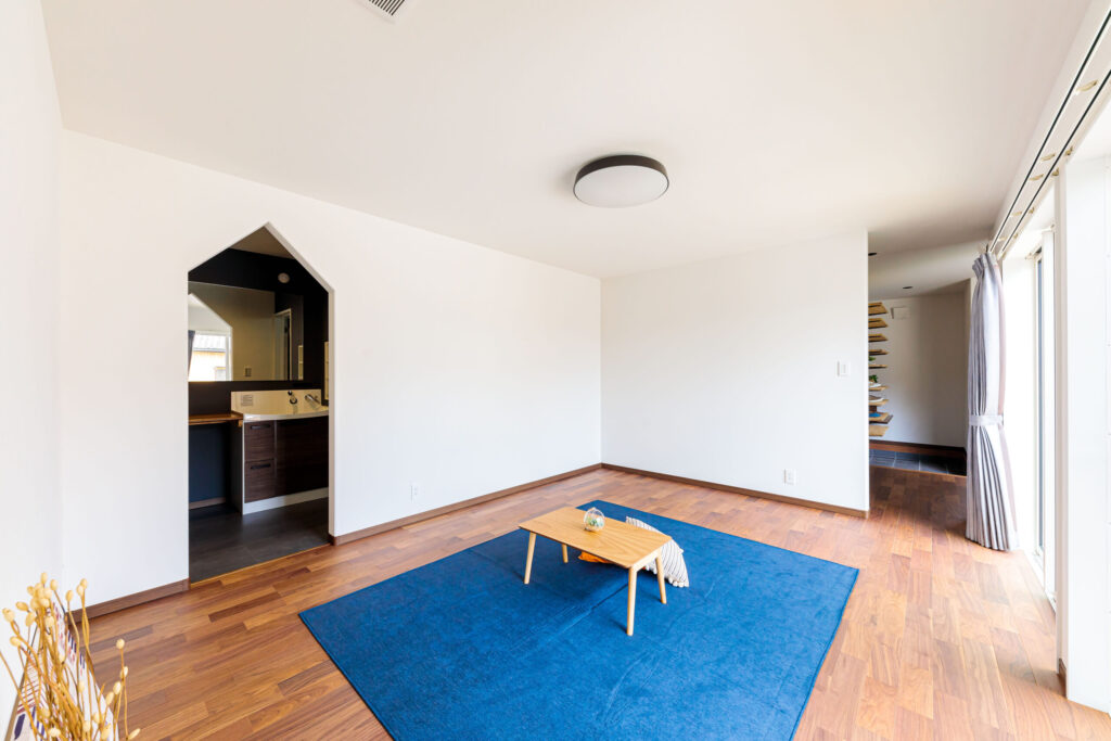 落ち着いた雰囲気のある塗り壁と瓦のお家は、コの字型で中庭を囲むようなデザイン。道路からの視線を遮りながらも光を取り入れることができるため明るく開放的に。家を真南に向くような配置にしたため、夏の日差しは室内に入りにくく冬は暖かいそう。1階で生活できるように2階は子ども室と収納のみの「ほぼ平家」のような間取り。そのため老後もリフォームなしで過ごせる設計が嬉しい。また、家族で楽しく過ごせる時間を増やすために家事動線も工夫した。その中でもお気に入りなのが室内ランドリーだ。雨天でも洗濯物が干すことができ花粉や虫もつかない上、畳まずに干しっぱなしで済むため時間の節約にも。50年後も安心して暮らしていける施主さんのこだわりが詰まった住まいになっている。