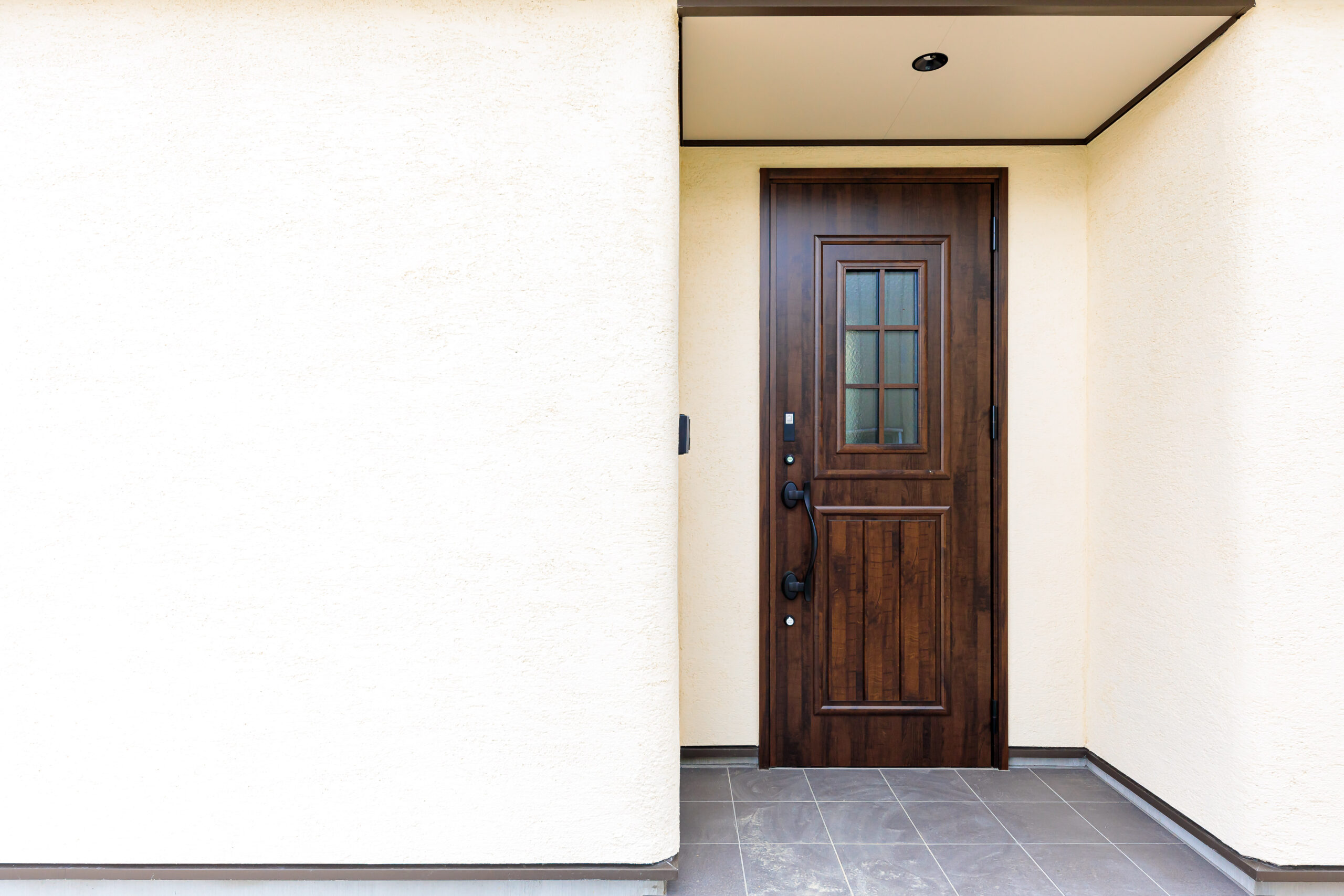 アンティークな玄関ドアと塗り壁と瓦屋根が落ち着いた雰囲気を出しています
