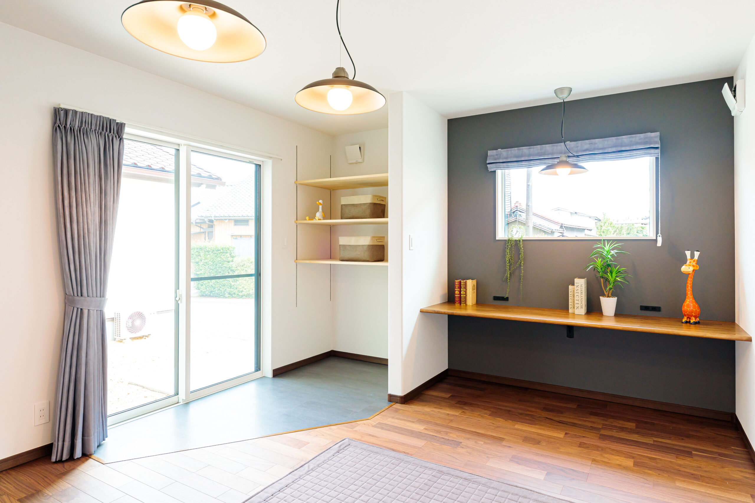 壁、カーテン、照明とグレーをポイントにコンセントの色も合わせています