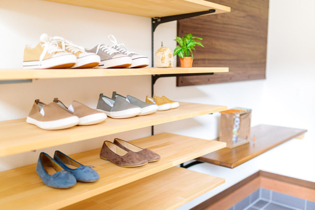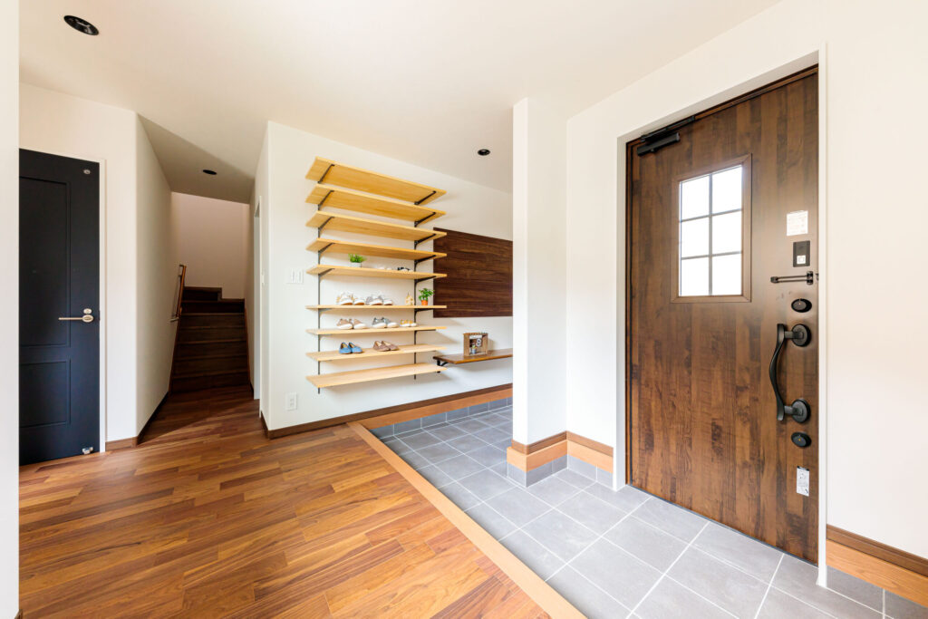 広々としたオープン玄関とオーダーのシューズクローク