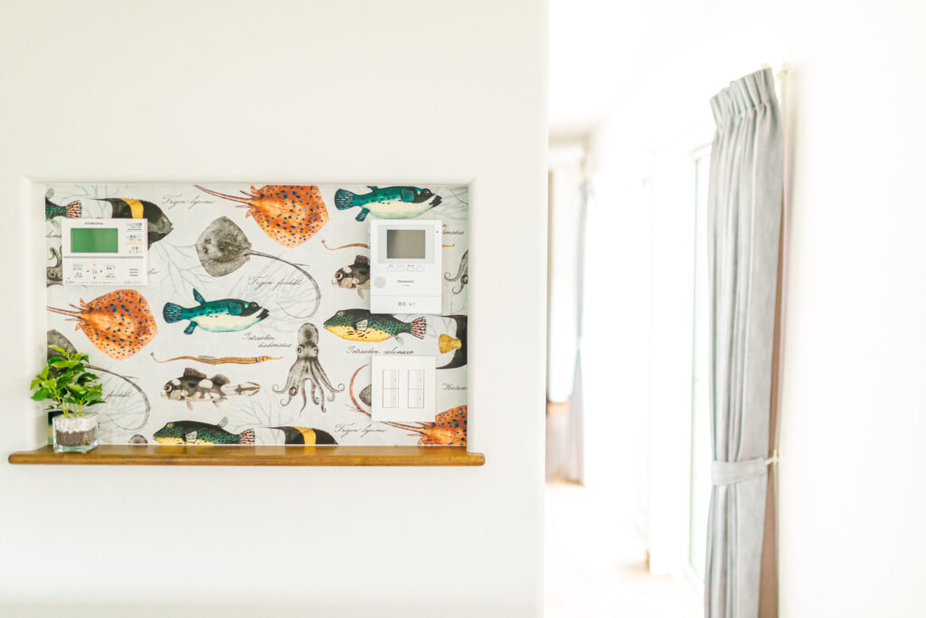 キッチン横の給湯器やインターホンなど壁から少し出っ張るので、ニッチをつくってスッキリと納めました