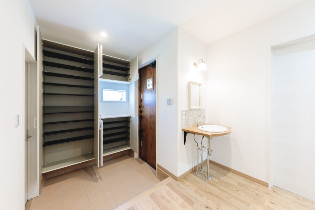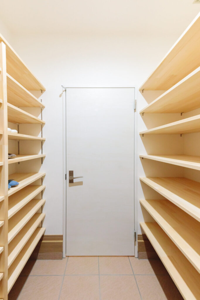 2世帯になると収納量も多くなります。大きなものもありますので玄関奥の土間収納にいれます