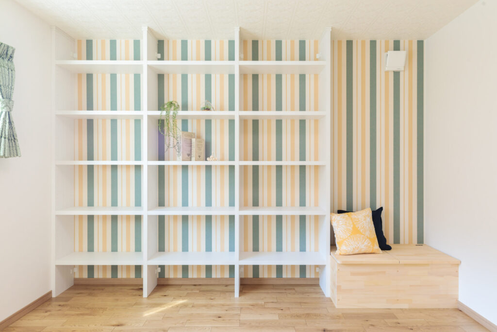 ベンチの下は収納になっています。このベンチに座って奥様が本を読み、棚には本だけではなく人形や花など飾る事ができます