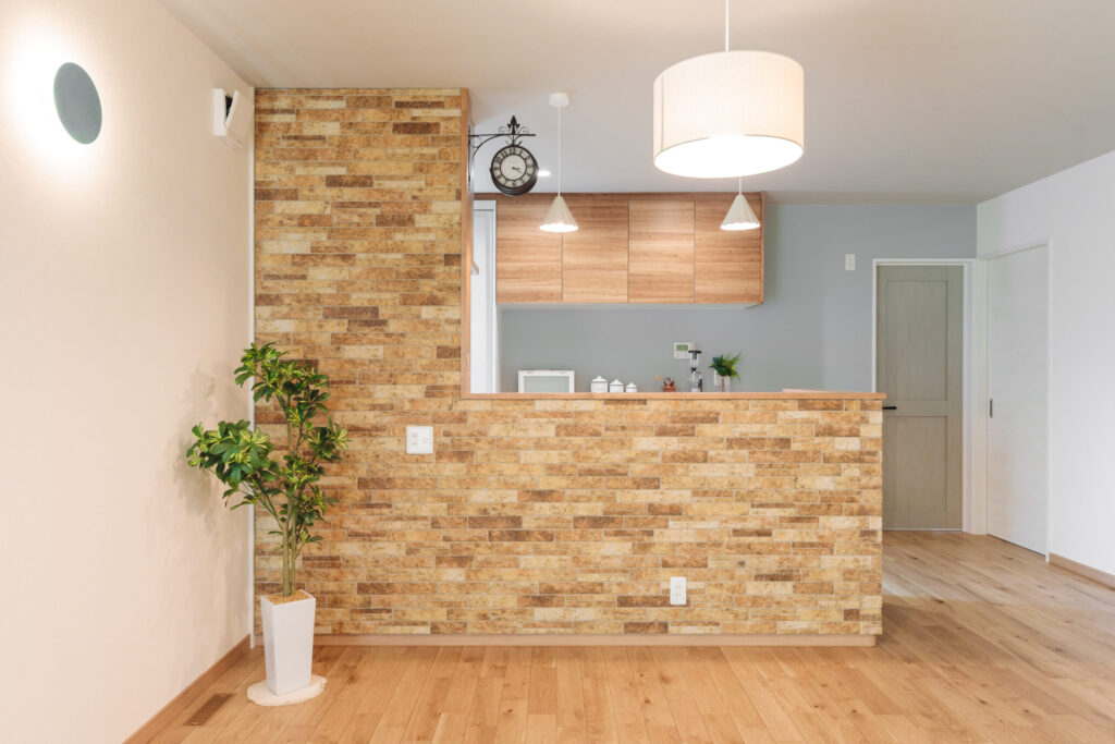 キッチンの壁は、石目の外壁材を張りました