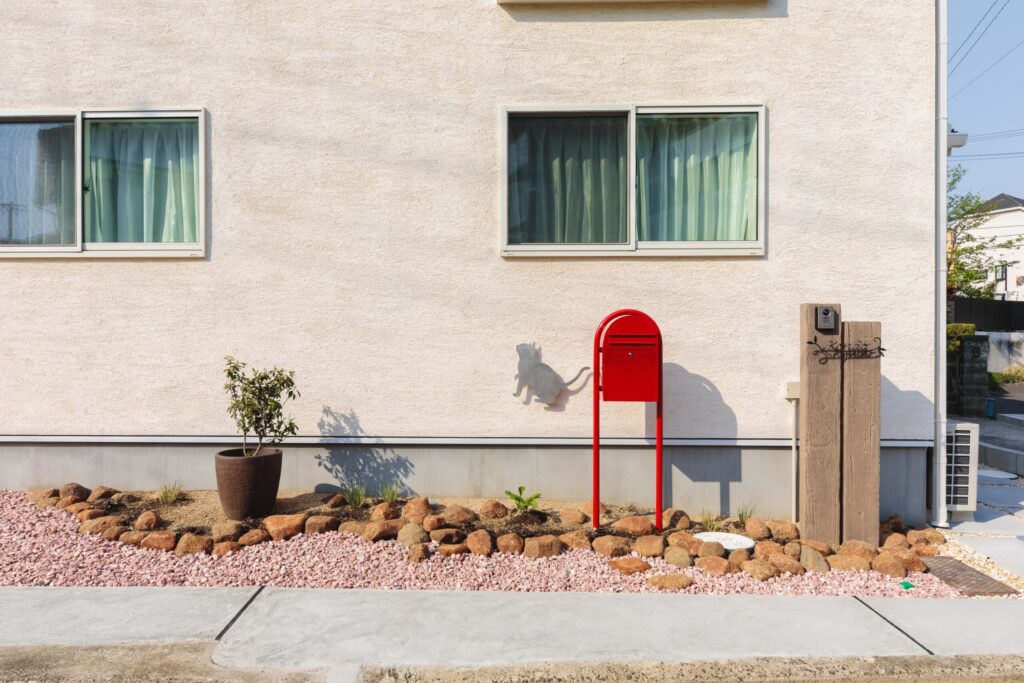 高さ制限で後退したスペースには、植栽とポストとネコの照明を付けました。