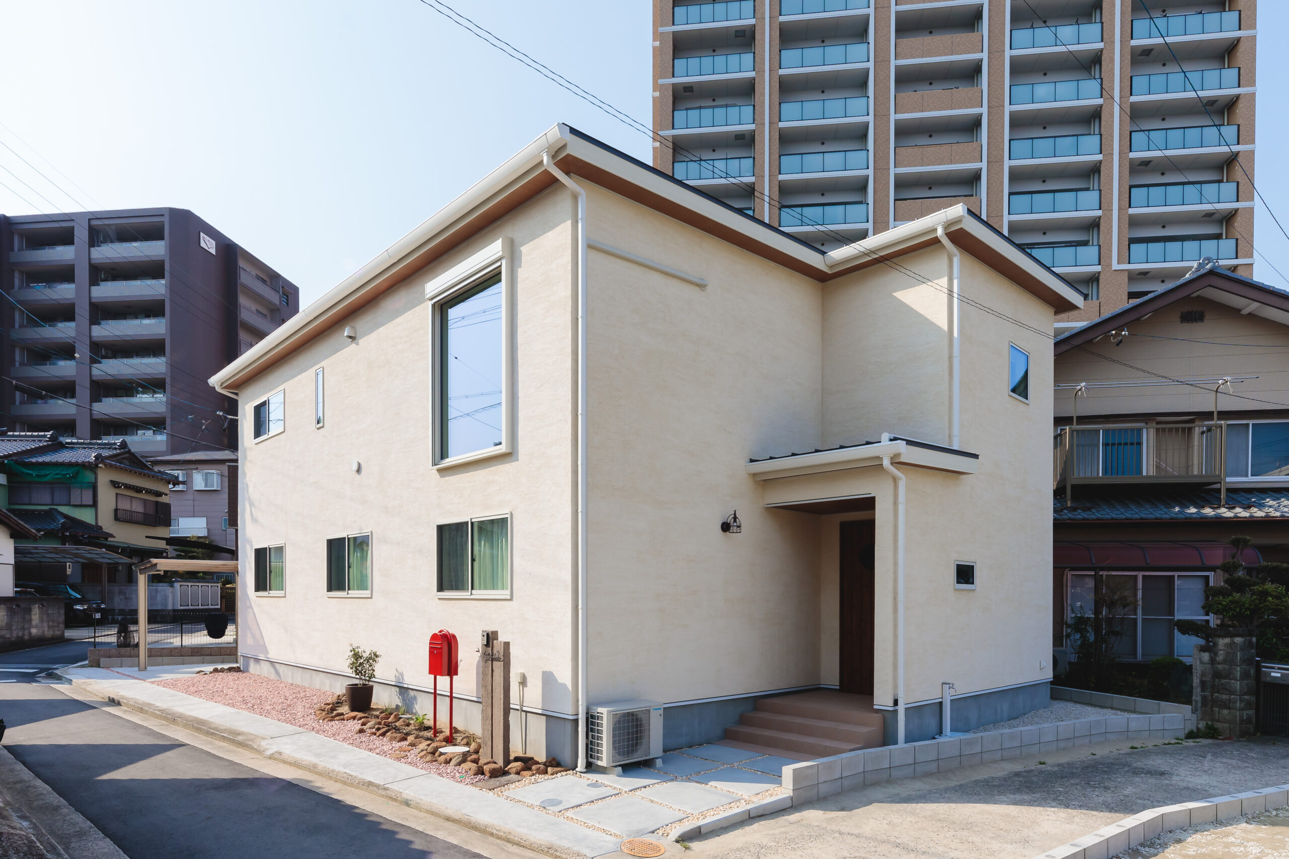 街中でマンションが立ち並ぶ中、一際目を引く優しい印象の二世帯住宅。法律制限がある中で、施主さんの要望を出来る限り詰め込むだけではなく、家での楽しみ方を取り入れた設計を提案した。その一つが「猫と暮らす家」。ポスト横には月を見あげるように配置された猫の照明があり、室内にも月の照明とキャットウォークを設けた。道路からの視線を避けるために2階に設計されたLDKは、大きなFIX窓が解放感と明るさをもたらしてくれる。二世帯住宅なので荷物も多く建築面積が大きくなりがちだが、収納も設計することで限られた面積を有効活用。家事動線も工夫し、室内ランドリーの隣にクローゼットを備えスムーズに。二世帯では特に家事設計が重要になるため、設計者と施主さんが一緒に家づくりしていくことが理想のお家づくりの重要ポイントだ