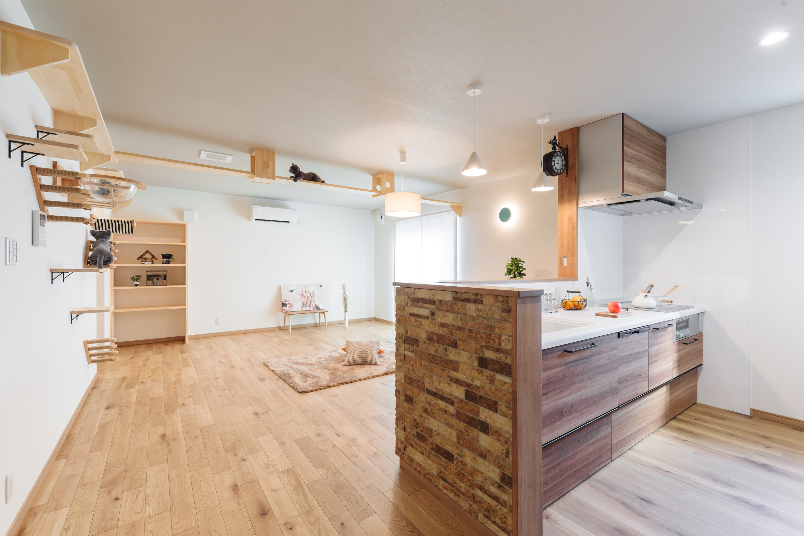 街中でマンションが立ち並ぶ中、一際目を引く優しい印象の二世帯住宅。法律制限がある中で、施主さんの要望を出来る限り詰め込むだけではなく、家での楽しみ方を取り入れた設計を提案した。その一つが「猫と暮らす家」。ポスト横には月を見あげるように配置された猫の照明があり、室内にも月の照明とキャットウォークを設けた。道路からの視線を避けるために2階に設計されたLDKは、大きなFIX窓が解放感と明るさをもたらしてくれる。二世帯住宅なので荷物も多く建築面積が大きくなりがちだが、収納も設計することで限られた面積を有効活用。家事動線も工夫し、室内ランドリーの隣にクローゼットを備えスムーズに。二世帯では特に家事設計が重要になるため、設計者と施主さんが一緒に家づくりしていくことが理想のお家づくりの重要ポイントだ